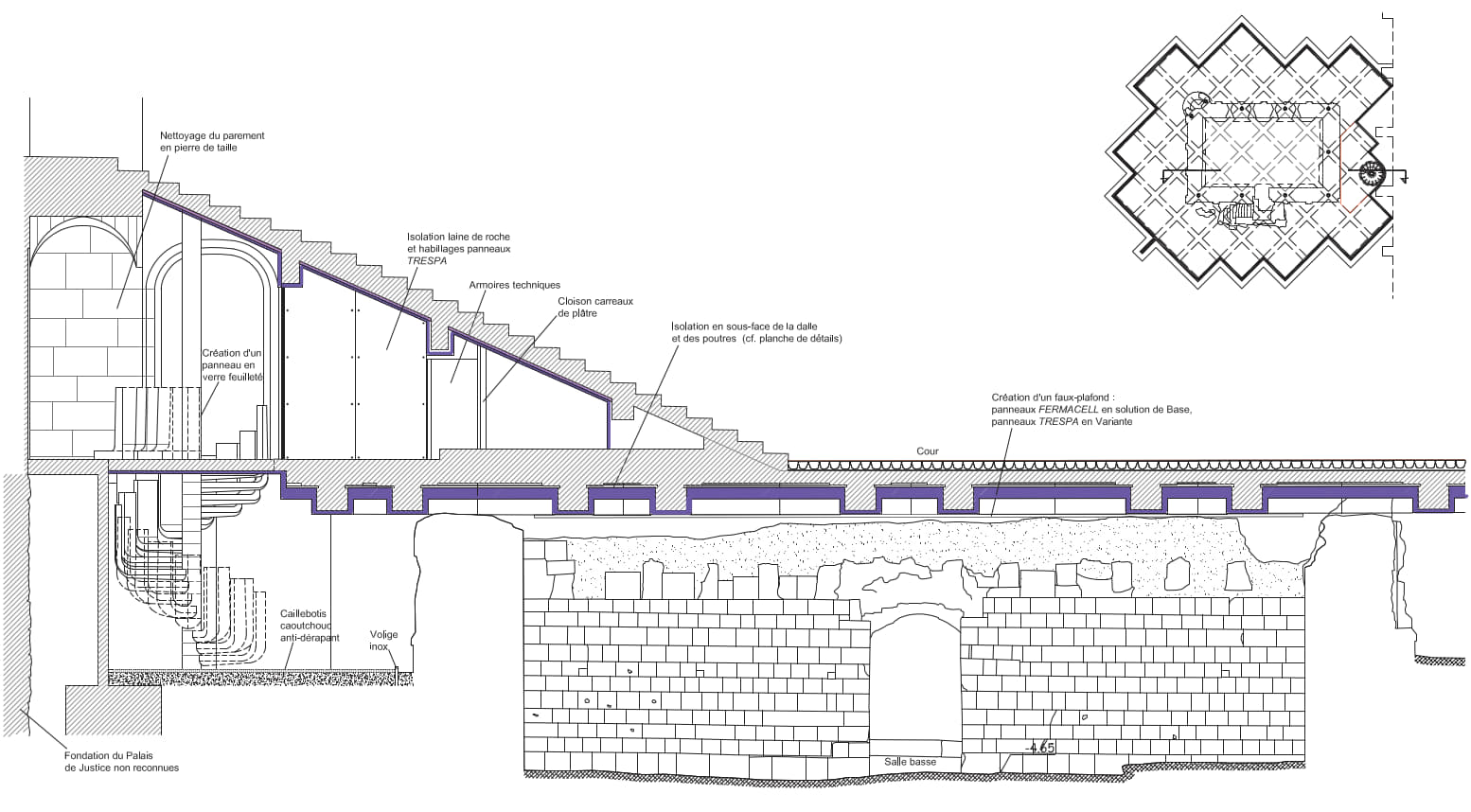 À la suite de la réalisation d’études de diagnostic et de mesures climatiques, la crypte qui abrite le Monument juif a fait l’objet de travaux d’isolation et de création d’un système de ventilation sophistiqué, permettant de maintenir un confinement en l’absence du public, mais aussi de créer une atmosphère saine lors de la présence du public. Une scénographie a permis la mise en valeur du monument tout en apportant un contenu pédagogique vis-à-vis des publics. Un ascenseur permet enfin l’accès des visiteurs en situation de handicap à la crypte.